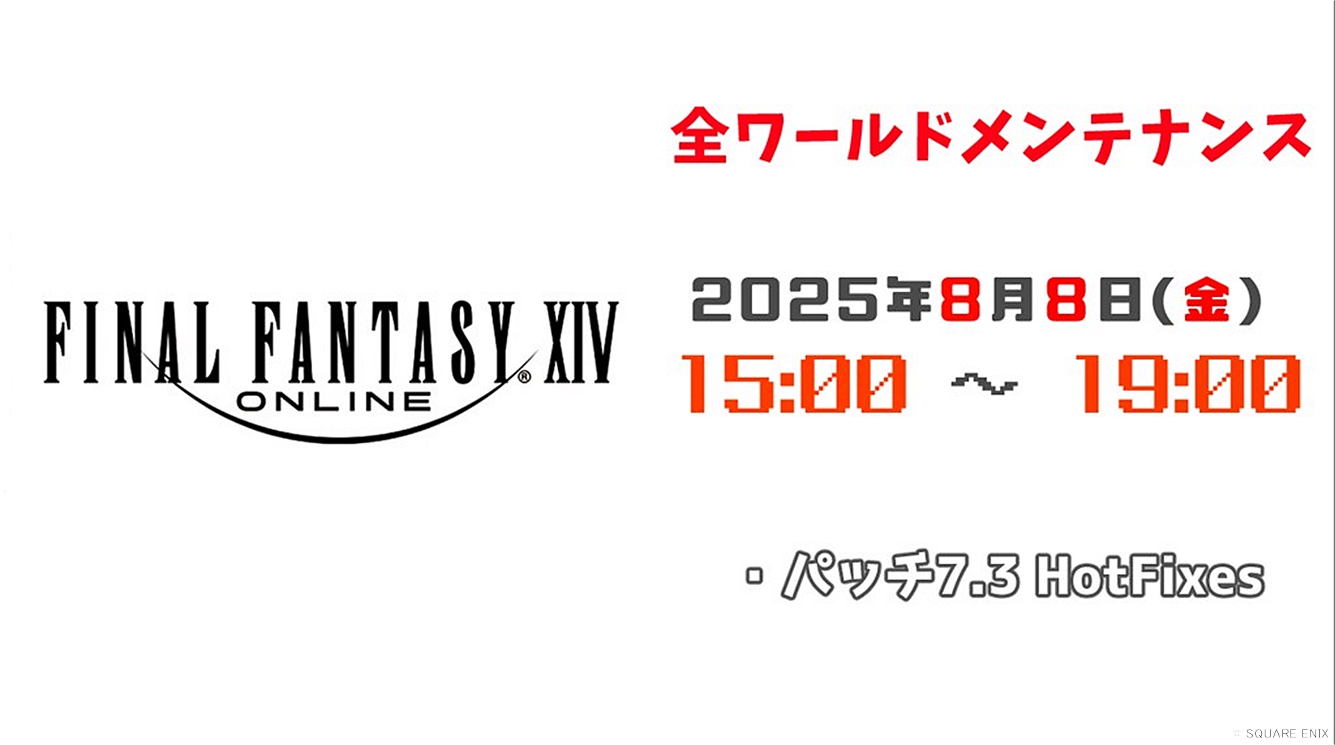 特定条件下でクライアントが強制終了してします不具合対応のため8日15時からパッチ7.3HotFixesに伴う全ワールドの緊急メンテナンス作業を実施とのこと。