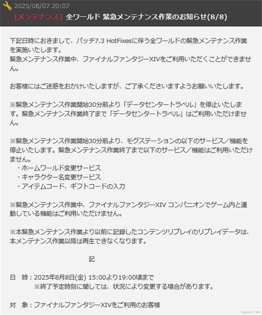 全ワールド 緊急メンテナンス作業のお知らせ(8/8) | FINAL FANTASY XIV, The Lodestone