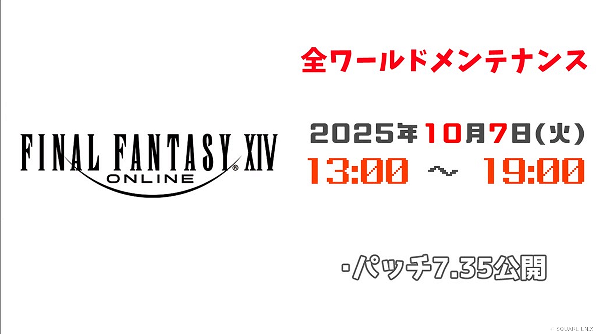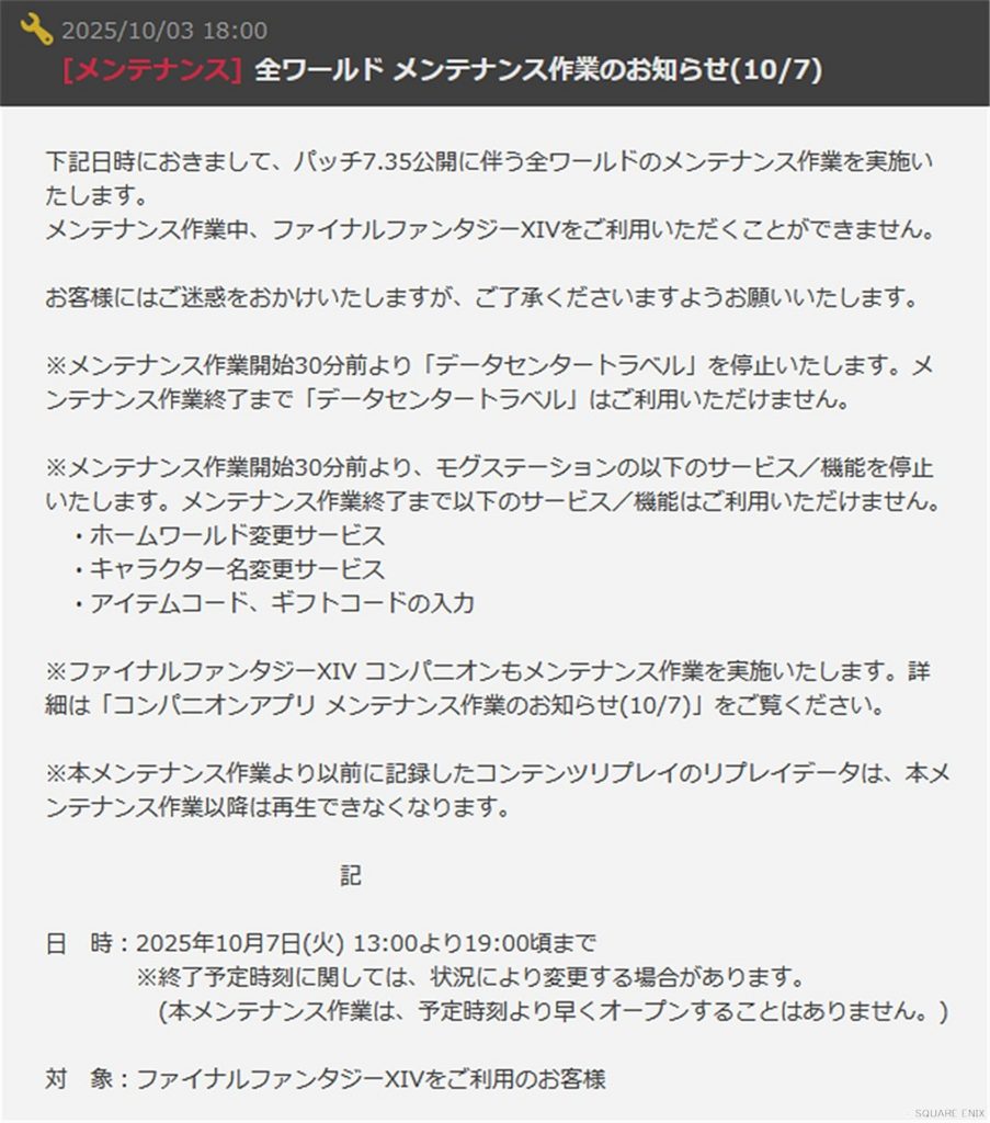 全ワールド メンテナンス作業のお知らせ(10/7) | FINAL FANTASY XIV, The Lodestone