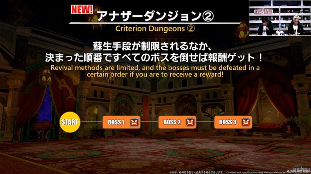 仕様の追加:プレーヤー自身がノックダウンしてしまうとワイプ扱いになっていたものが、1ボスでワイプした場合1回1個、2回2個命ストックが追加しそのワイプしたボスをクリアするとリセット(8人のボスバトルコンテンツのように)