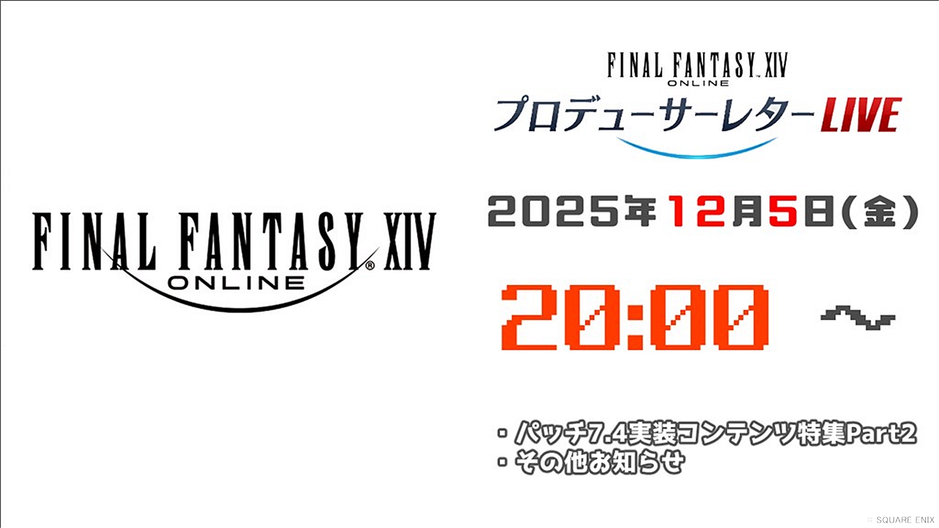 PLL関連12月16日公開予定のパッチ7.4「霧の中の理想郷」の内容を実機を交えて紹介する第90回プロデューサーレターライブ「パッチ7.4実装コンテンツ特集Part2」が放送とのこと。