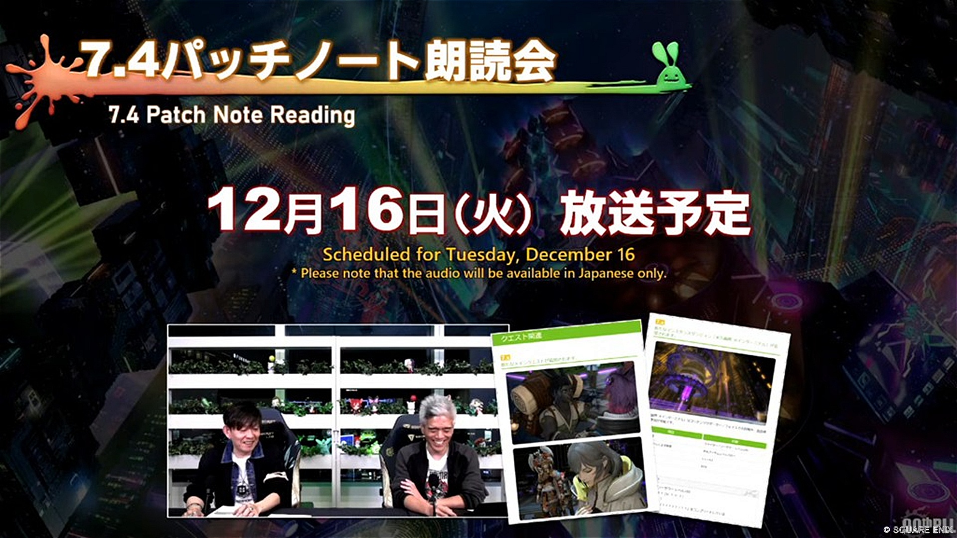 【FF14】吉田Pと一緒に7.4アップデートの内容を確認するパッチノート朗読会が12月16日16時から放送! 朗読会 X Facebook はてブ LINE コピー 2025.12.09 スポンサーリンク パッチ7.4アップデート日当日の16時から吉田Pとパッチノートを確認する朗読会が放送されます。わかりにくい部分は補足してくれたりなどあるので時間のある方はお見逃しなく! 日時 2025年12月16日(火)16:00~ 視聴先 YouTube Live ニコニコ生放送 Twitch