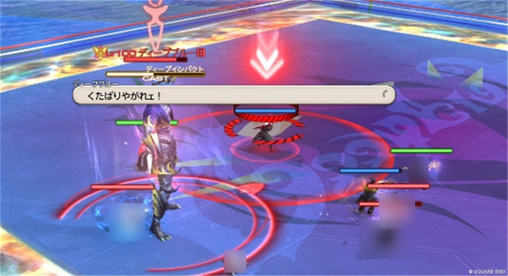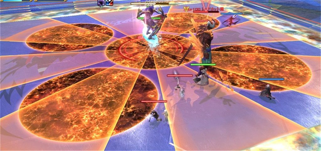 - 頭上にマーカーが付いた対象者にボスが移動した場所から扇範囲とデバフ床