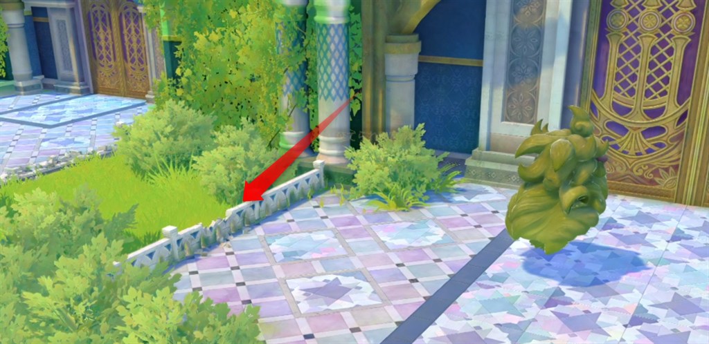 - 「風精」が2体いる建物入り口左にある壊れかけの石の手すりに「風精」の攻撃を当てる(対象者が移動して当てる)