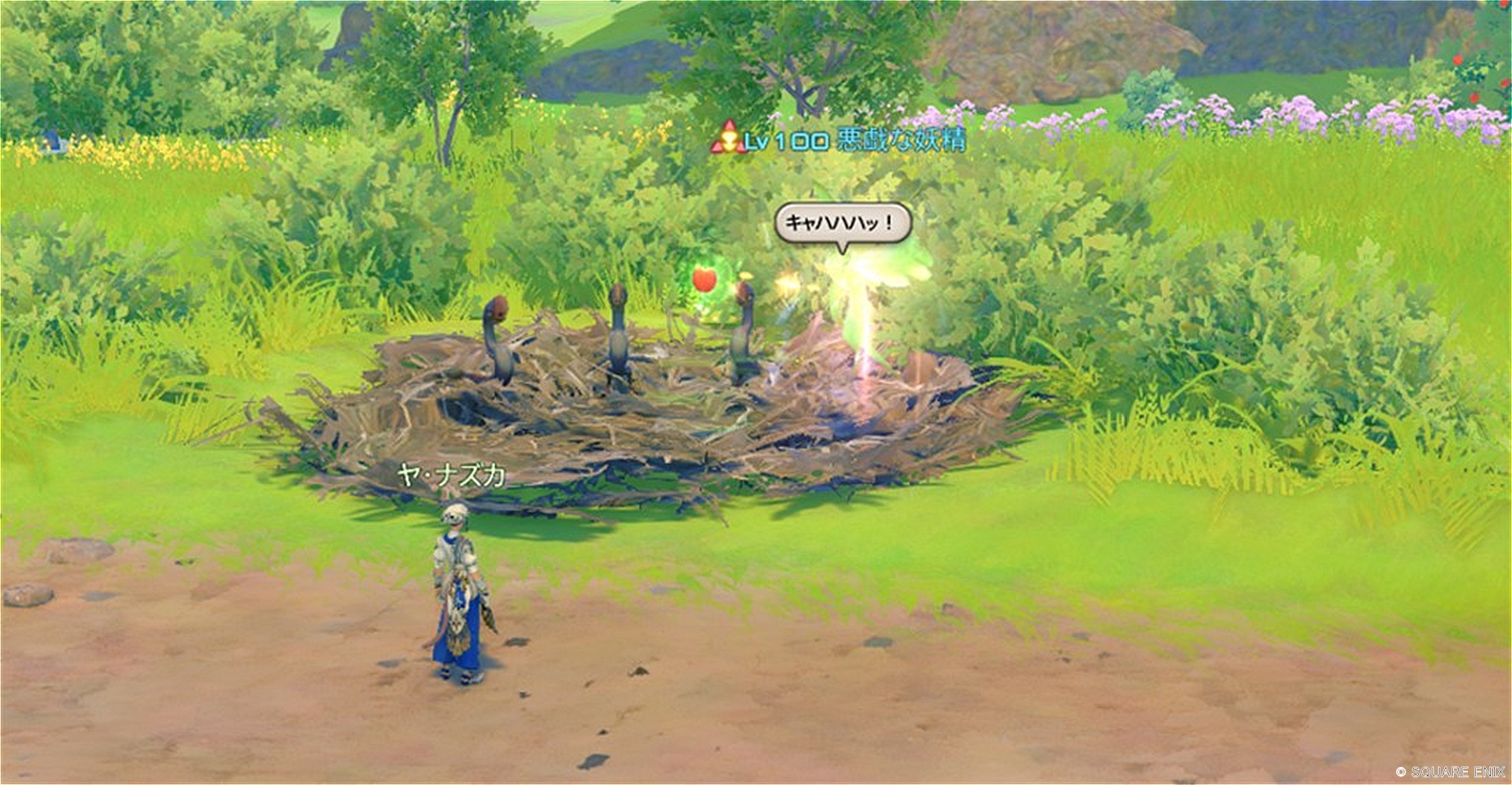 - 鳥の巣に「悪戯な妖精」が現れリンゴを盗もうとするので攻撃(範囲攻撃があるので注意)