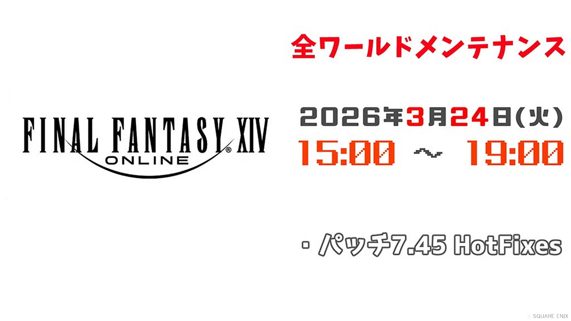 【FF14】3月24日15時から19時まで 7.45 HotFixesに伴う全ワールドメンテ実施! メンテナンス X Facebook はてブ LINE コピー 2026.03.20 スポンサーリンク 7.45 HotFixesに伴う全ワールドメンテナンスが実施されるとのこと。 日時 2026年3月24日(火) 15:00 ~ 19:00 全ワールド メンテナンス作業のお知らせ(3/24) | FINAL FANTASY XIV, The Lodestone全ワールド メンテナンス作業のお知らせ(3/24)